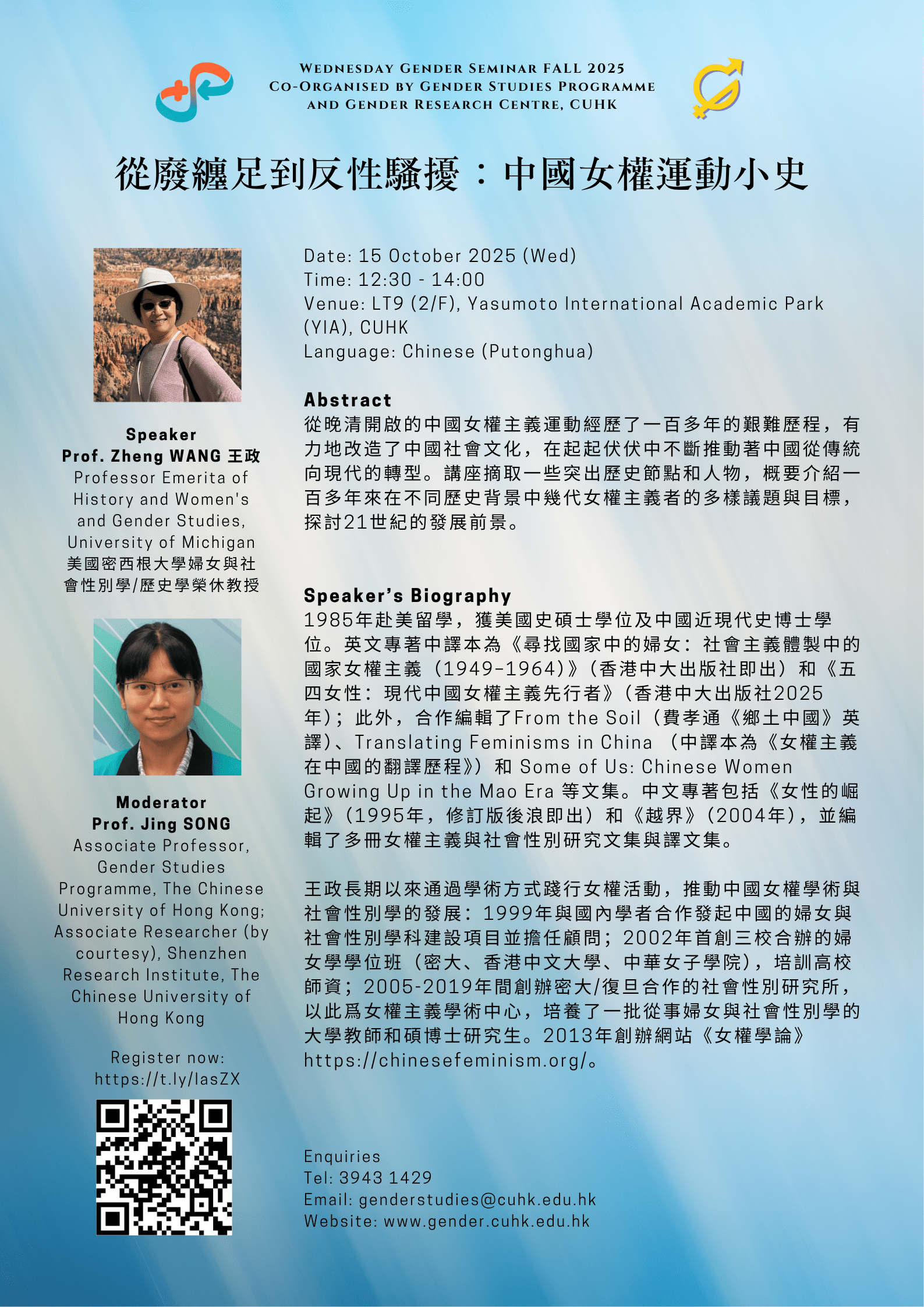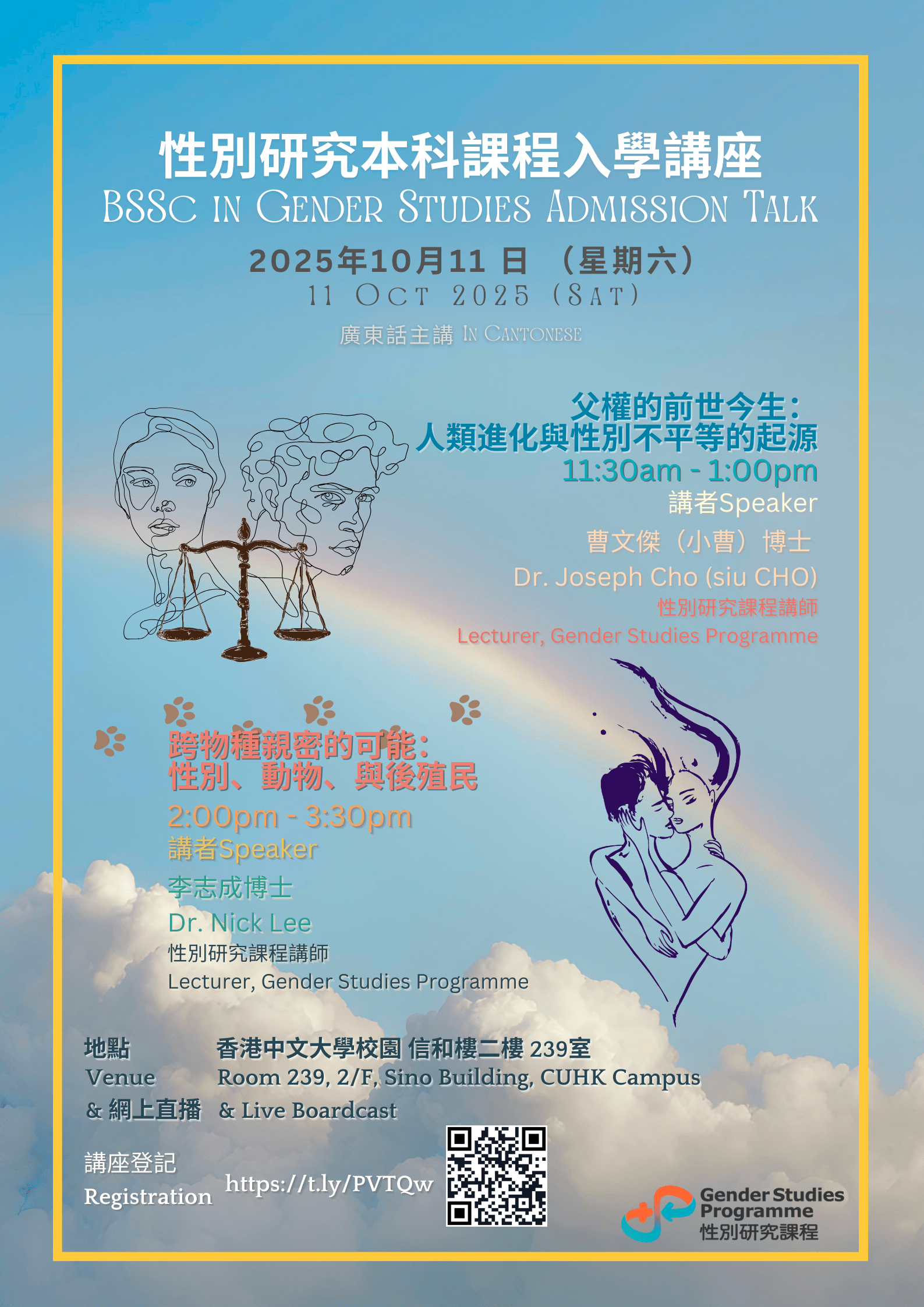 主頁 » 活動與新聞 » 活動 活動 活動與新聞 活動 入學講座 學術會議 公開講座 週三性別座談會 週三性別座談會重溫 其他活動 新聞 公告 媒體報導 11月 11 2025 Information Session for Admission of MPhil-PhD in Gender Studies at CUHK with Tips on Writing a Research Proposal 入學講座 Date: 11 Nov 2025 (Tue) Time: 4:00pm – 4:45pm (HKT) Venue: Zoom (Online) 更多 10月 17 2025 Orientation for Gender Research Centre and Gender Studies Programme 2025 其他活動 Date: 17 Oct 2025 (Fri) Time: 3:00 – 5:00 pm Venue: Conference Room 505, Hong Kong Institute of Asia-Pacific Studies, 5/F Esther Lee Building, CUHK 更多 10月 15 2025 從廢纏足到反性騷擾:中國女權運動小史 週三性別座談會 Date: 15 Oct 2025 (Wed) Time: 12:30 – 14:00 Venue: LT9, 2/F, Yasumoto International Academic Park (YIA), CUHK 更多 10月 11 2025 香港中文大學性別研究本科課程入學講座 BSSc in Gender Studies, CUHK Admission Talk 入學講座 Date: 11 Oct 2025 (Sat) Session 1: 11:30am- 1:00pm; Session 2: 2:00pm – 3:30pm Venue: Room 239, 2/F, Sino Building, CUHK Campus & Live Broadcast 更多 09月 24 2025 Gender Inequality in Academia: A Longitudinal Study of South Korea and Taiwan (2008-2023) 週三性別座談會 Date: 10 Sep 2025 (Wed) Time: 12:30 – 14:00 Venue: Online (Zoom link to be provided after registration) 更多 09月 10 2025 The Modern Chinese Family Landscape from the Perspective of Indigenous Feminism: A Brief Discussion on Mosaic Modernity and Mosaic Familialism 週三性別座談會 Date: 10 Sep 2025 (Wed) Time: 12:30 – 14:00 Venue: Room G01, G/F, Hui Yeung Shing Building (HYS G01), CUHK 更多 09月 10 2025 The Modern Chinese Family Landscape from the Perspective of Indigenous Feminism: A Brief Discussion on Mosaic Modernity and Mosaic Familialism 週三性別座談會重溫 Date: 10 September 2025 (Wed) 更多 09月 03 2025 Wednesday Gender Seminar Fall 2025 週三性別座談會 Co-presented by: Gender Studies Programme and Gender Research Centre, The Chinese University of Hong Kong 更多 06月 18 2025 2025 International Summer Workshop – Ageing Well in Digital Times through an Intersectionality Lens 其他活動 Date: 18-19 June, 2025 (Wed-Thu) Time: Time: 09:00-14:00 Sweden/ 15:00-20:00 Hong Kong 更多 04月 09 2025 Selling Masculinities: the Gender Performance and Intimate Labours of Bar T in Chinese Lesbian Bars 週三性別座談會 Date: 9 April 2025 (Wed) Time: 12:30 – 14:00 Venue: Room G01, G/F, Hui Yeung Shing Building (HYS G01), CUHK 更多 1 2 3 4 5 6 7 8 ... 42 »